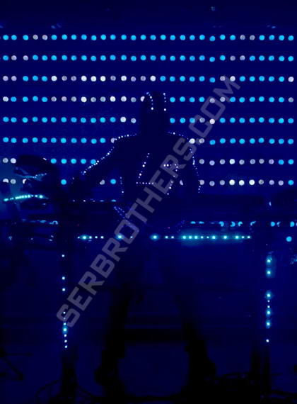 Для управления используется Art-Net контроллер и програмное обеспечение Resolume. Это позволяет синхронизировать находящиеся на сцене экраны, светодиодные приборы и светодиодный пиджак в реальном времени.