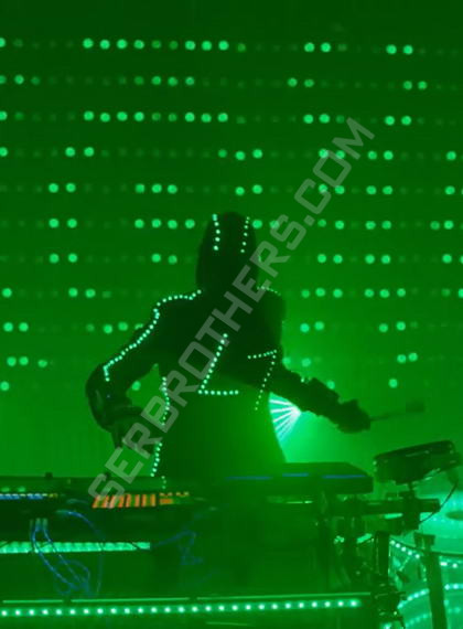Данный пиджак со светодиодами разработан специально для диджея который помимо игры за пультом, играет на различных инструментах, loop машине, барабанах так же управляет светоприборами находящимися вокруг него.